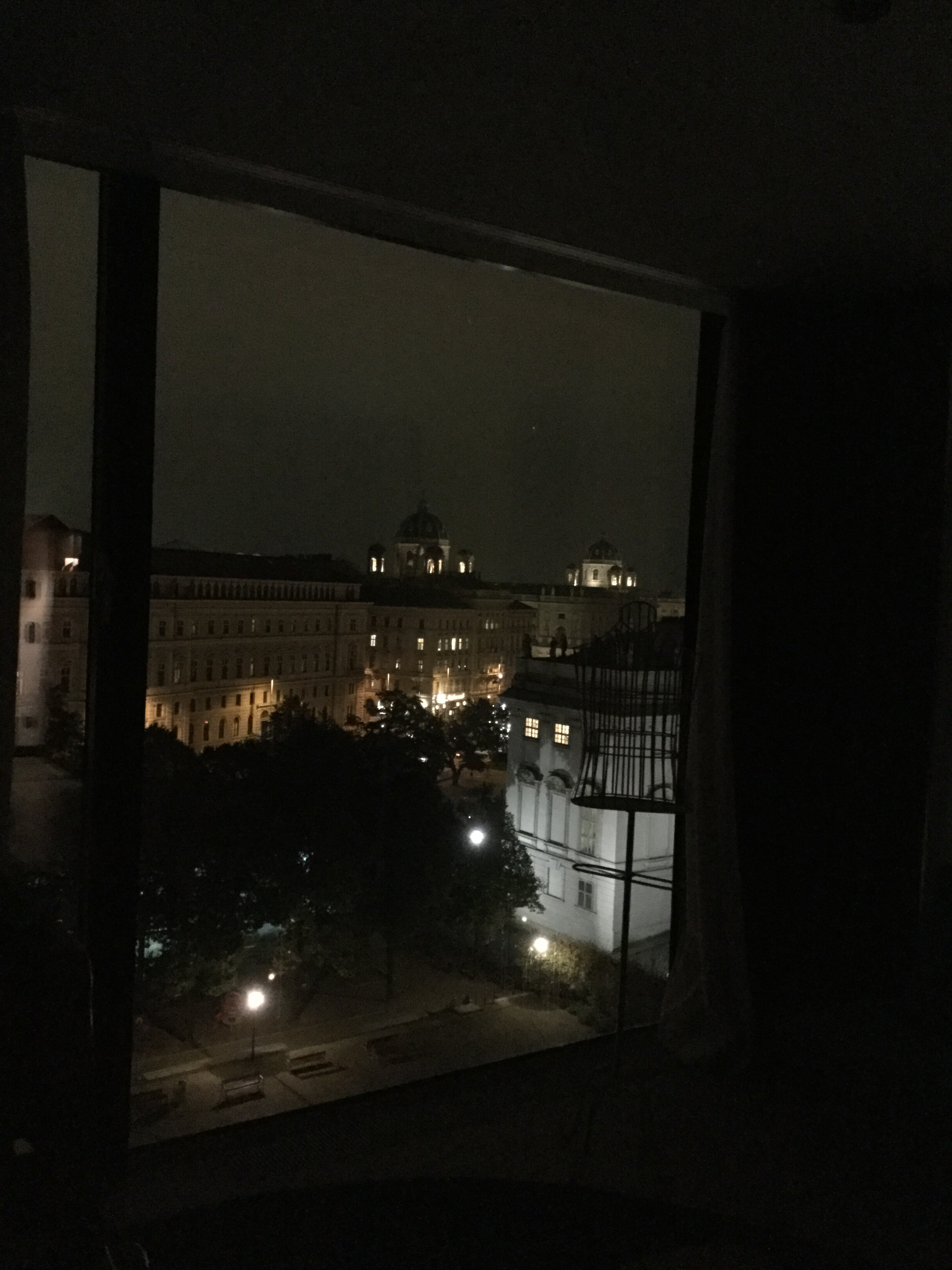 If you go on a trip and want to come back and share photos, you’d be well advised to check you’ve got the right camera card with you. Well, I hadn’t and so the only photo I can share from my recent trip to Vienna is this photo taken with my iPad. Vienna by night from my hotel room. The domes you see in the background belong to the Natural History Museum and the Museum of Fine Arts.
