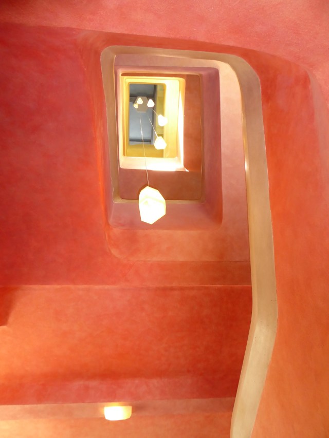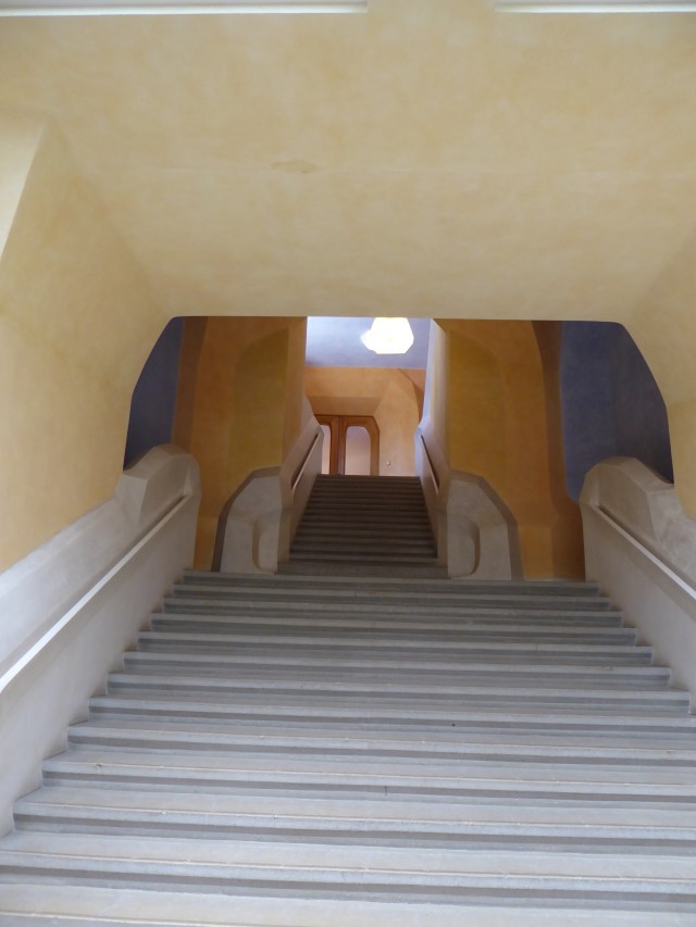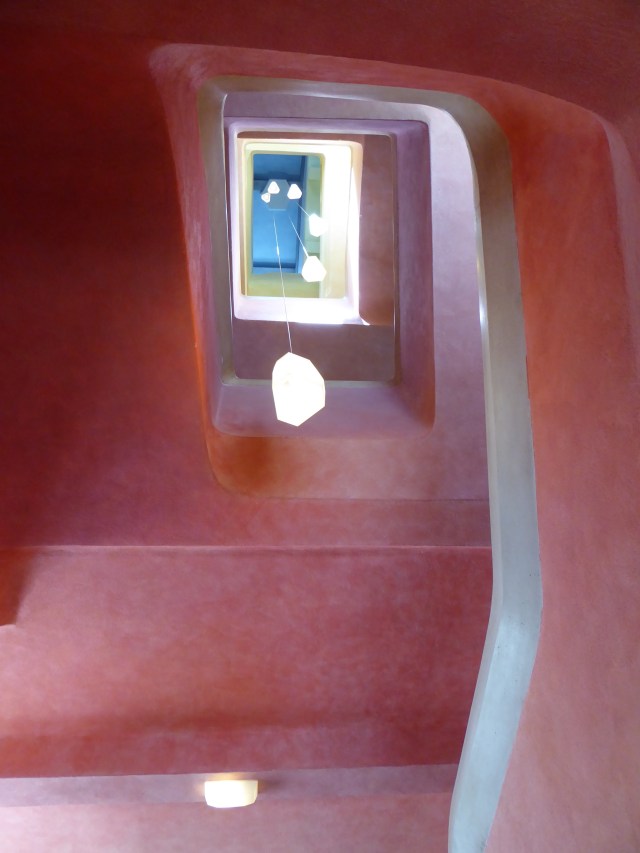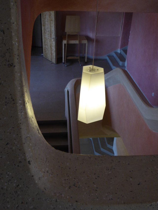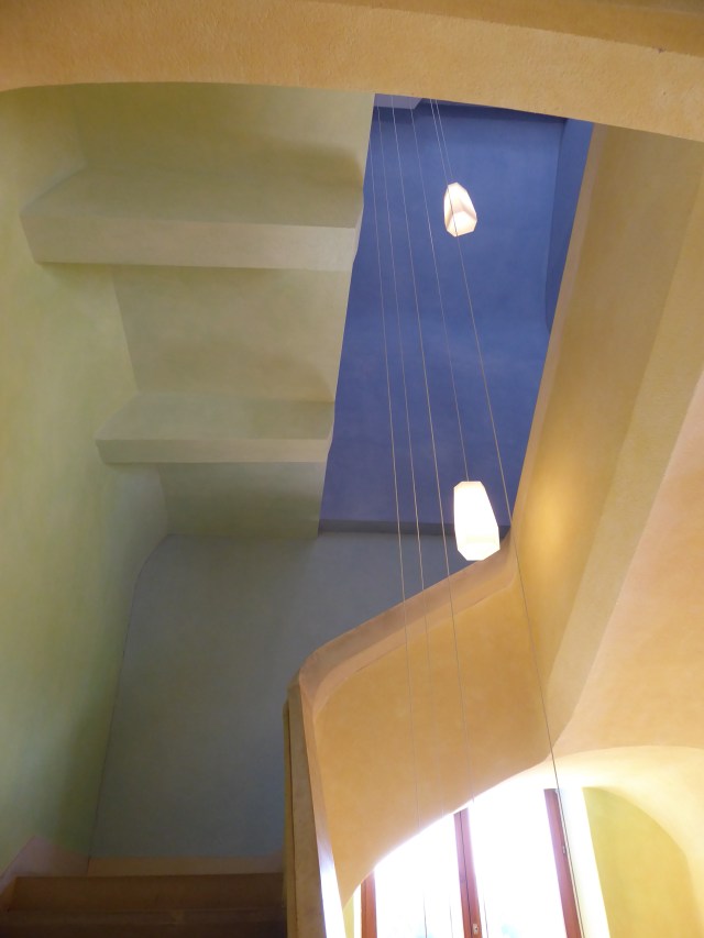 When I saw the house last, it was all grey concrete, inside and outside. I was pleased to discover that they started to paint the inside. It enhances the delicate, intricate architecture. One stair case was particularly stunning. Every floor was painted a different color, ceilings included and that gave you the impression of experiencing the color, bathing in colored light. Truly magical.